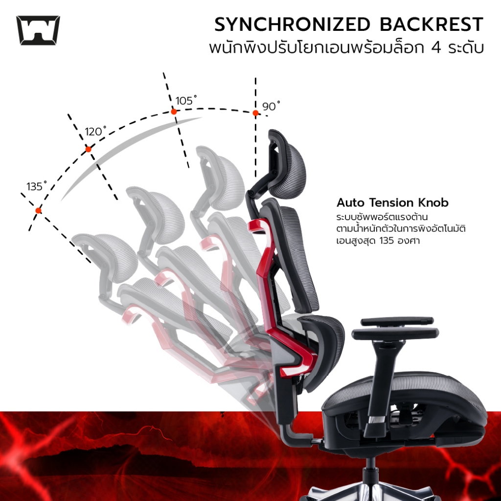 ✔️ Auto Tension Knob: ระบบซัพพอร์ตแรงต้านตามน้ำหนักตัวในการพิงอัตโนมัติ เอนสูงสุด 135 องศา