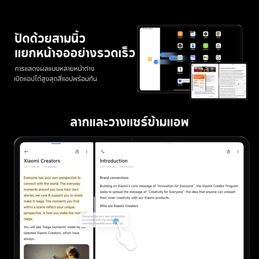 *ขนาดหน้าจอของ Xiaomi Pad 6 ใหญ่ประมาณ 11 นิ้ว ในรูปสี่เหลี่ยมผืนผ้าเมื่อวัดในแนวทแยง พื้นที่แสดงเนื้อหาจริงจะเล็กกว่าเนื่องจากดีไซน์ขอบโค้งของเครื่อง และค่าที่วัดได้จากผลิตภัณฑ์แต่ละเครื่องอาจแตกต่างกัน”
