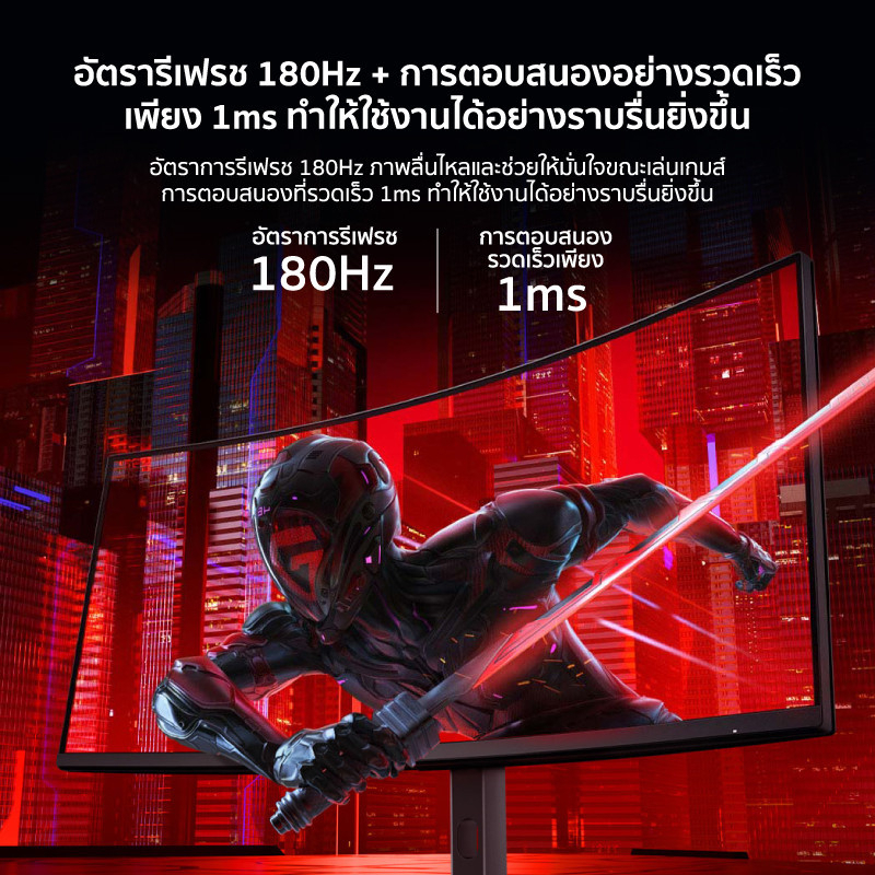 • Refresh rate 180Hz ตอบสนองอย่างรวดเร็ว Response time 1ms, ลดความเมื่อยล้าของดวงตาได้อย่างมีประสิทธิภาพ และยังเอื้อประโยชน์ต่อการเล่นเกมแนว FPS ที่ต้องการการตอบสนองอย่างรวดเร็ว